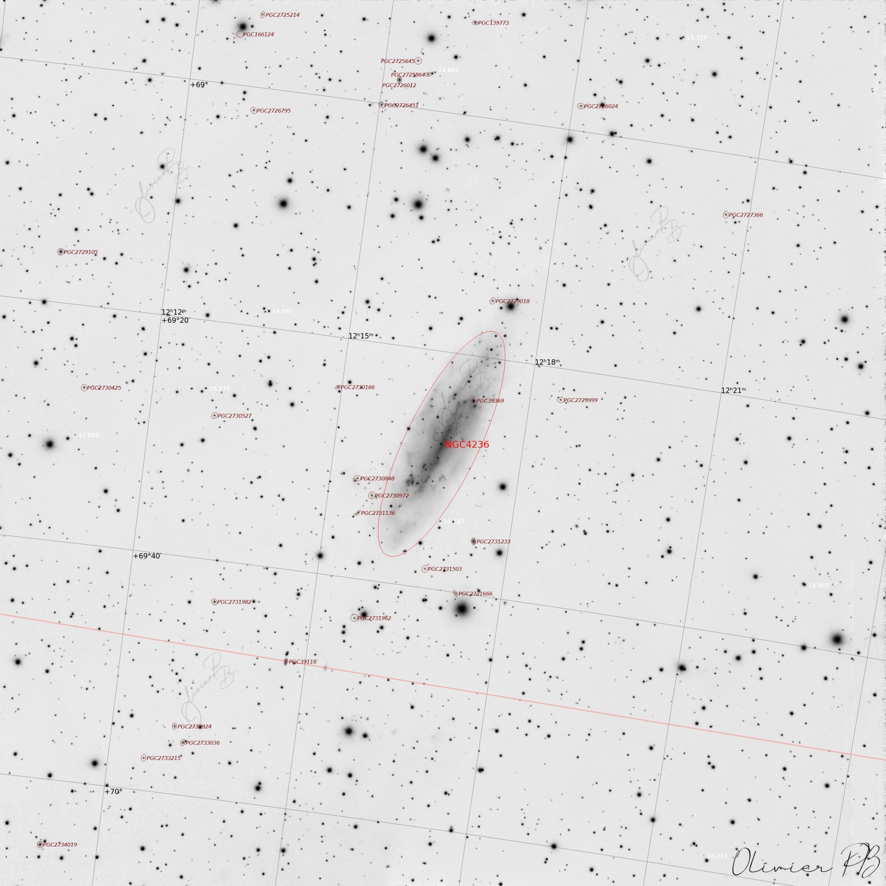 NGC 4236 NGC 4236 (aussi appelé Caldwell 3) est une galaxie spirale barrée de type magellanique vue par la tranche et située dans la constellation du Dragon à environ 11 millions d,années-lumière de la Voie lactée.