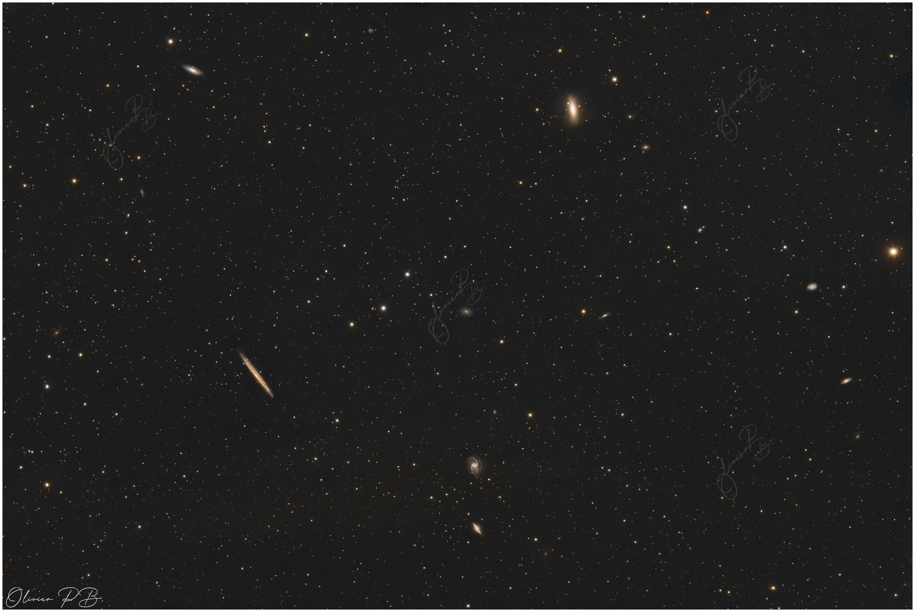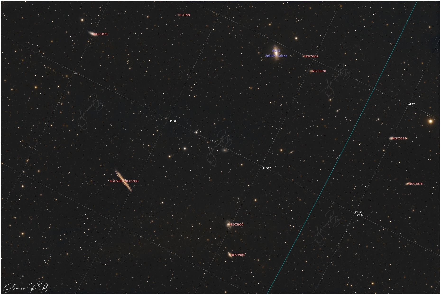 La galaxie de l'échardeNGC 5907 , est aussi nommée la galaxie de la lame de couteau elle se situe dans la constellation du Dragon à environ 46 millions d'années de lumière.on peut voir sur la version annotée pleins d'autres galaxies