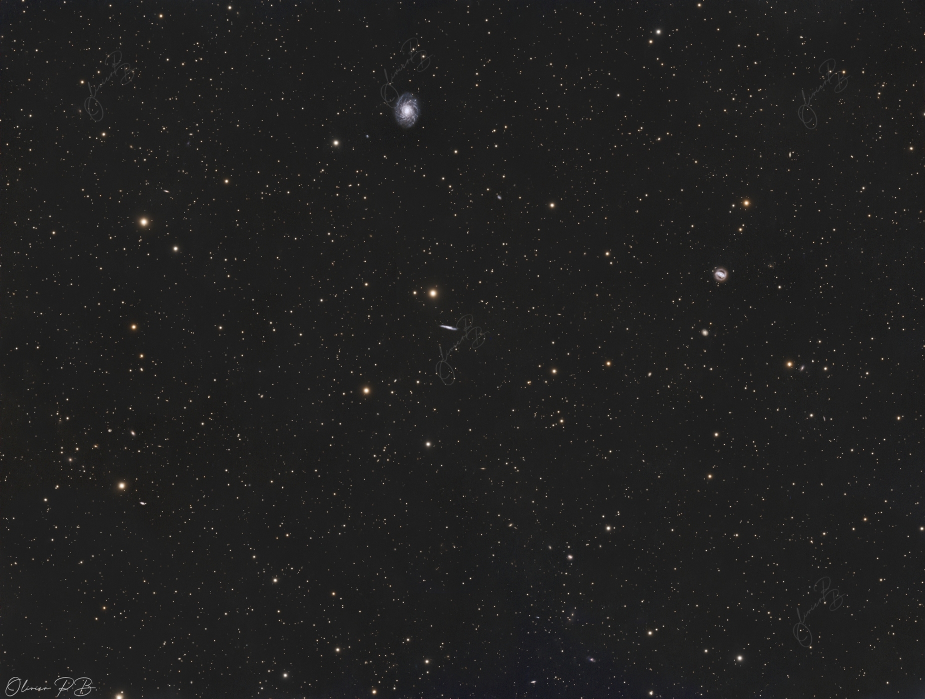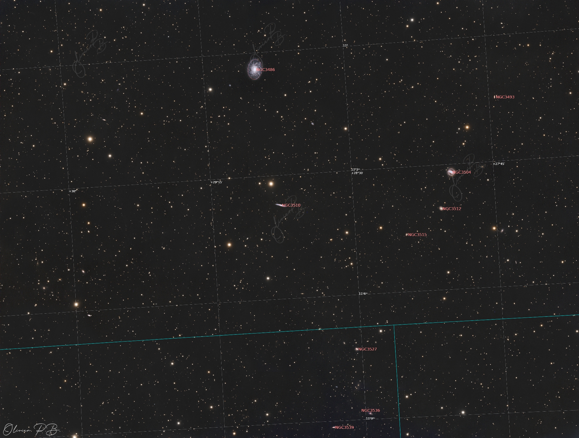 Trio de galaxie dans le Petit LionLa galaxie principale de ce trio est NGC 3486 , une spirale barrée , à environ 27 millions d'années de lumière les 2 autres galaxies NGC 3510 et NGC 3504 se situent elles aussi dans la constellation du Petit Lion.
