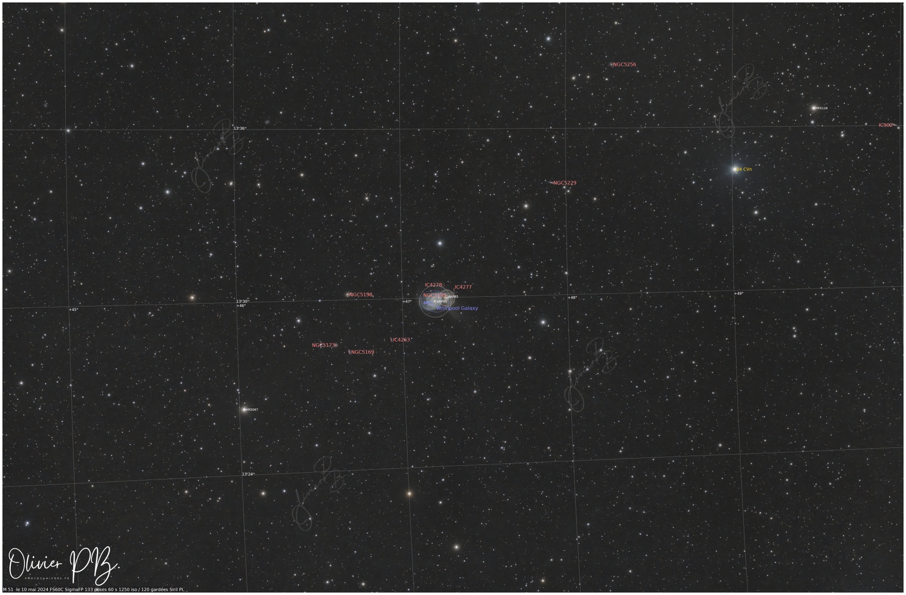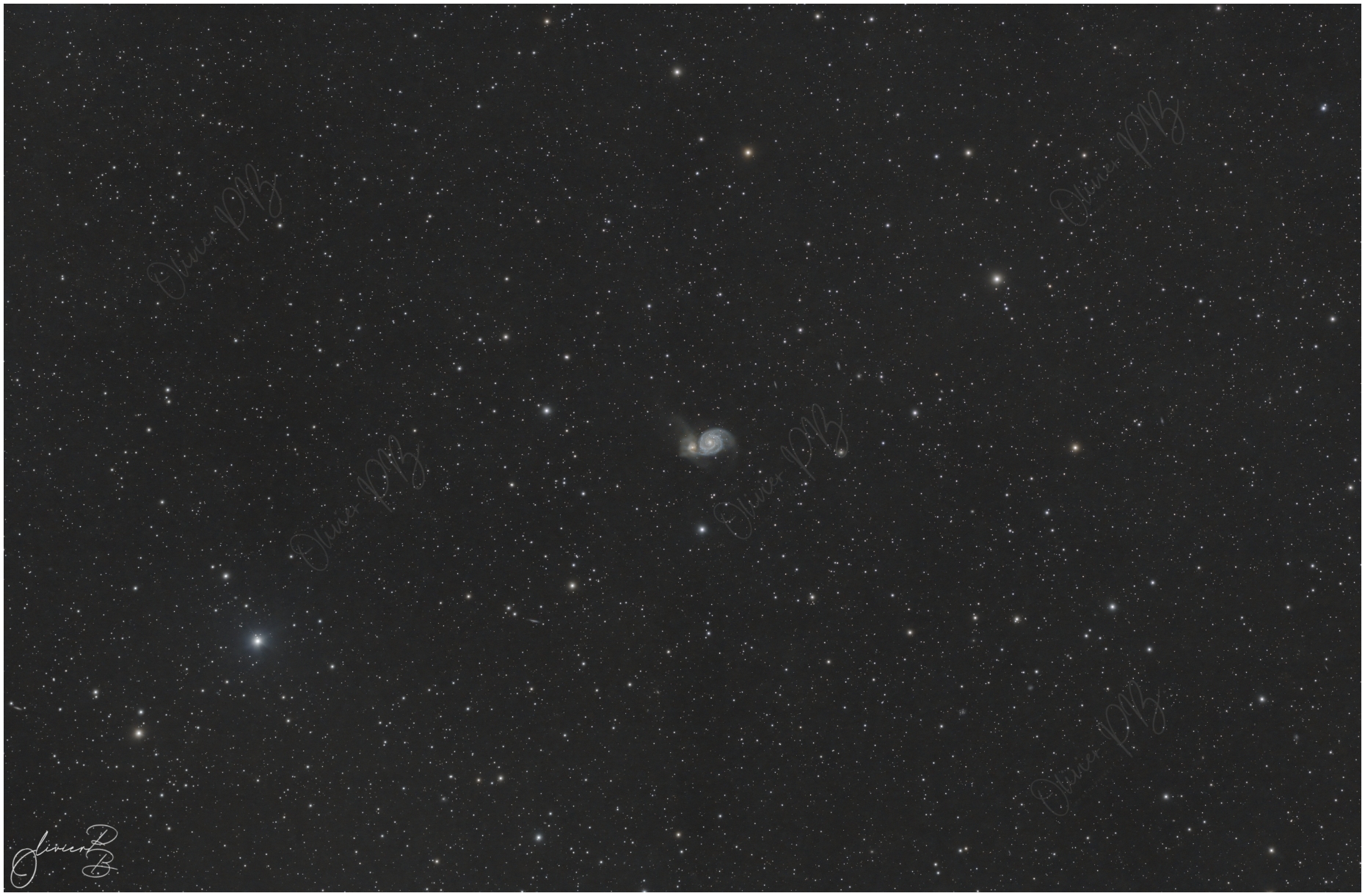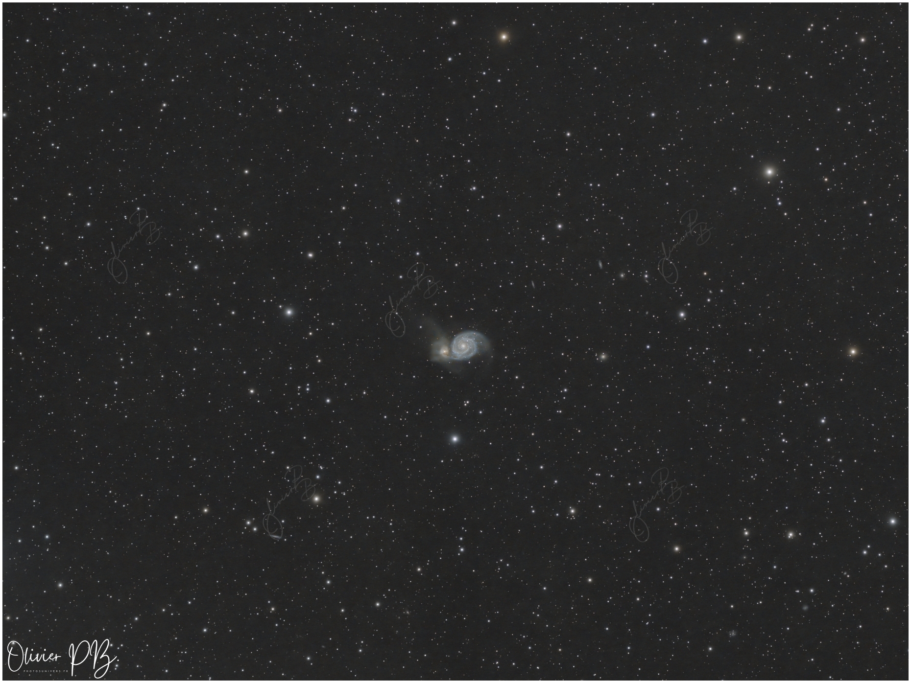 Cette trés belle galaxie, est en fait constituée de deux galaxies (NGC 5195) en interaction ,Messier 51 attirant NGC 5195; elle se situe dans la constellation des Chiens de Chasse à environ 23 millions d'année de lumière.