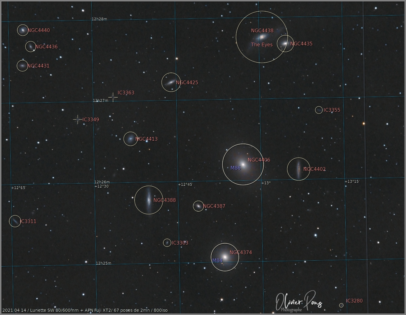 La chaîne comprend huit galaxies : M84, M86, NGC 4477, NGC 4473, NGC 4461, NGC 4458, NGC 4438 et NGC 4435. Source :Wikipédia
