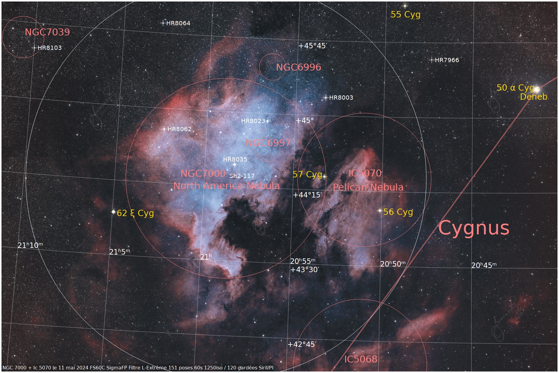 Deux nébuleuses d'été célèbres , la plus grande NGC7000 ou North america et IC5070 ou nébuleuse du pélican , ce sont deux vastes nébuleuses en émission situées dans la constellation du Cygne .