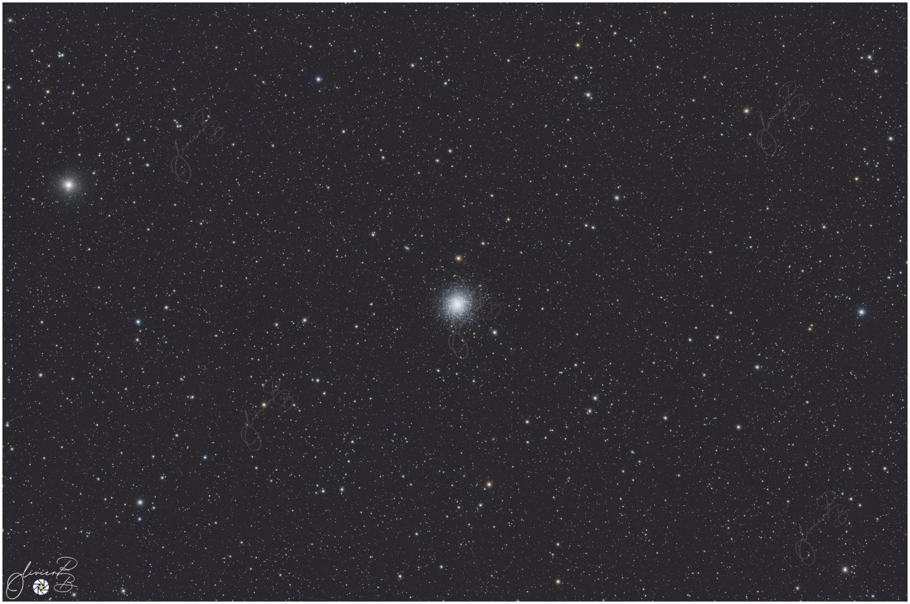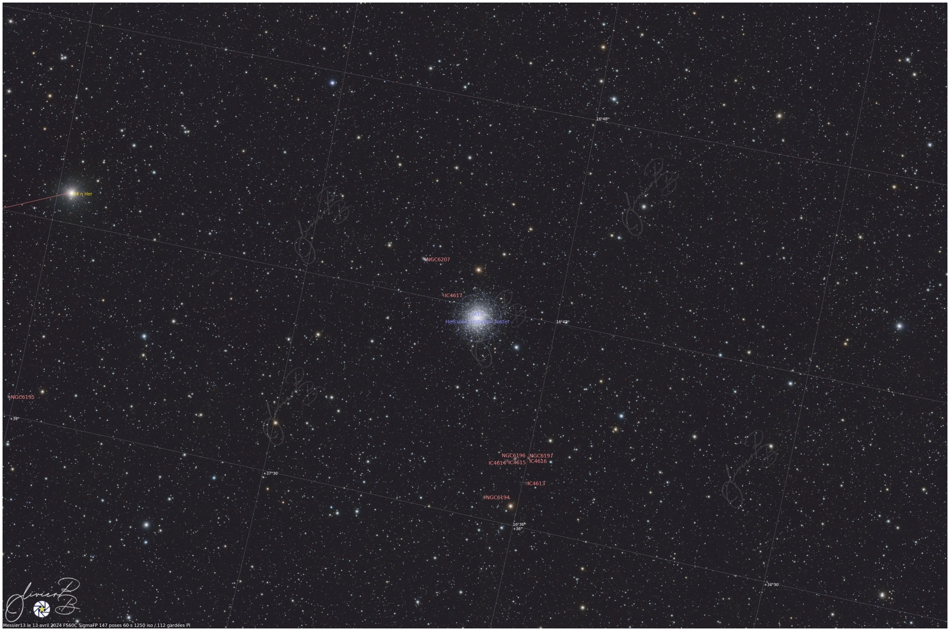 L' amas globulaire Messier 13 est le plus célèbre amas visible depuis l'hémisphère nord ; il est situé dans la constellation d'Hercule. les amas globulaires sont des ensembles ,composés de milliers de vieilles étoiles, situés en périphérie de notre galaxie . Ce sont les plus vieux objets de notre voie lactée..