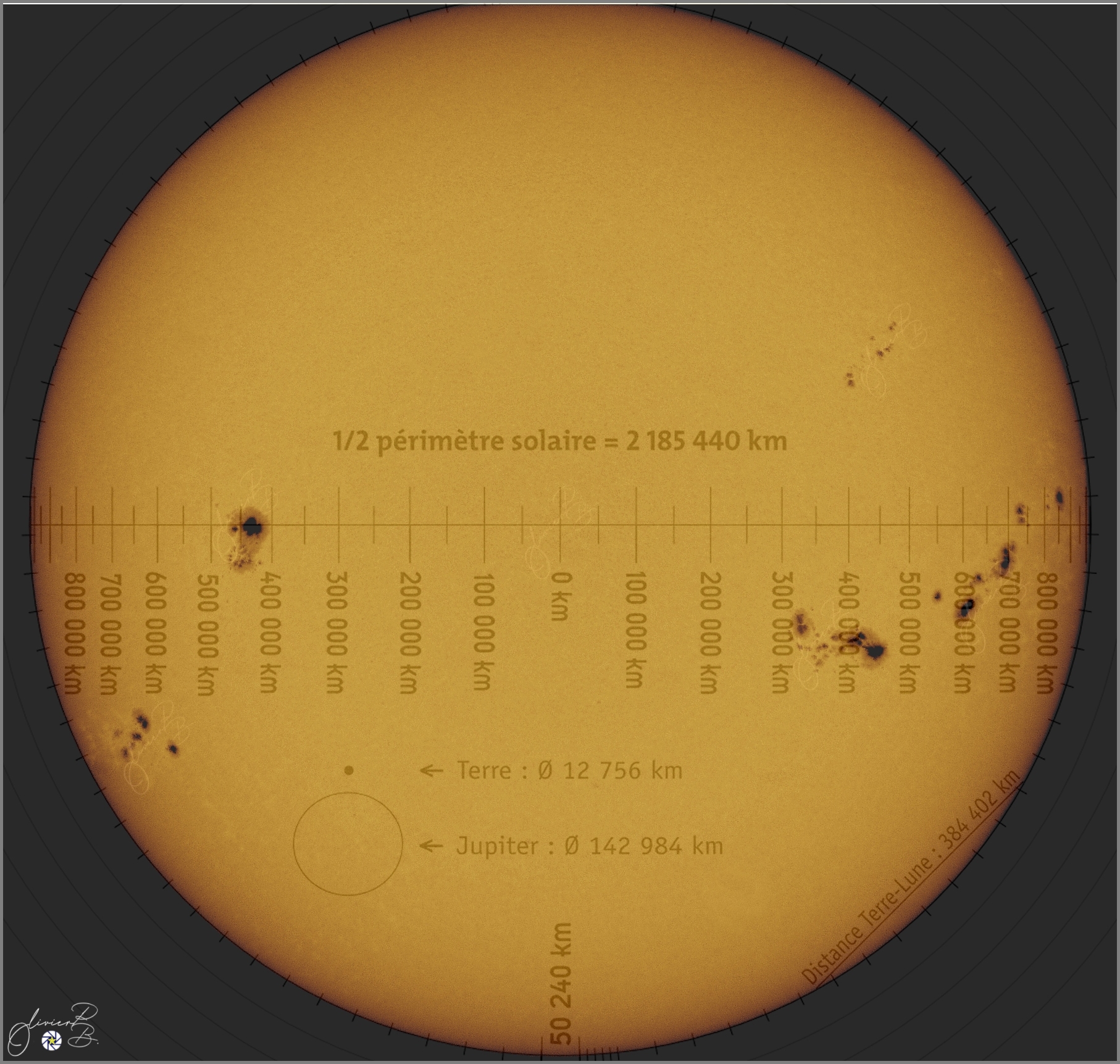 Taches solairesL'activité solaire le 5 octobre 2024 , avec de nombreuses taches sur la photosphère ; ces taches ont été le préalable aux aurores boréales visibles depuis la France la nuit du 10 octobre 2024