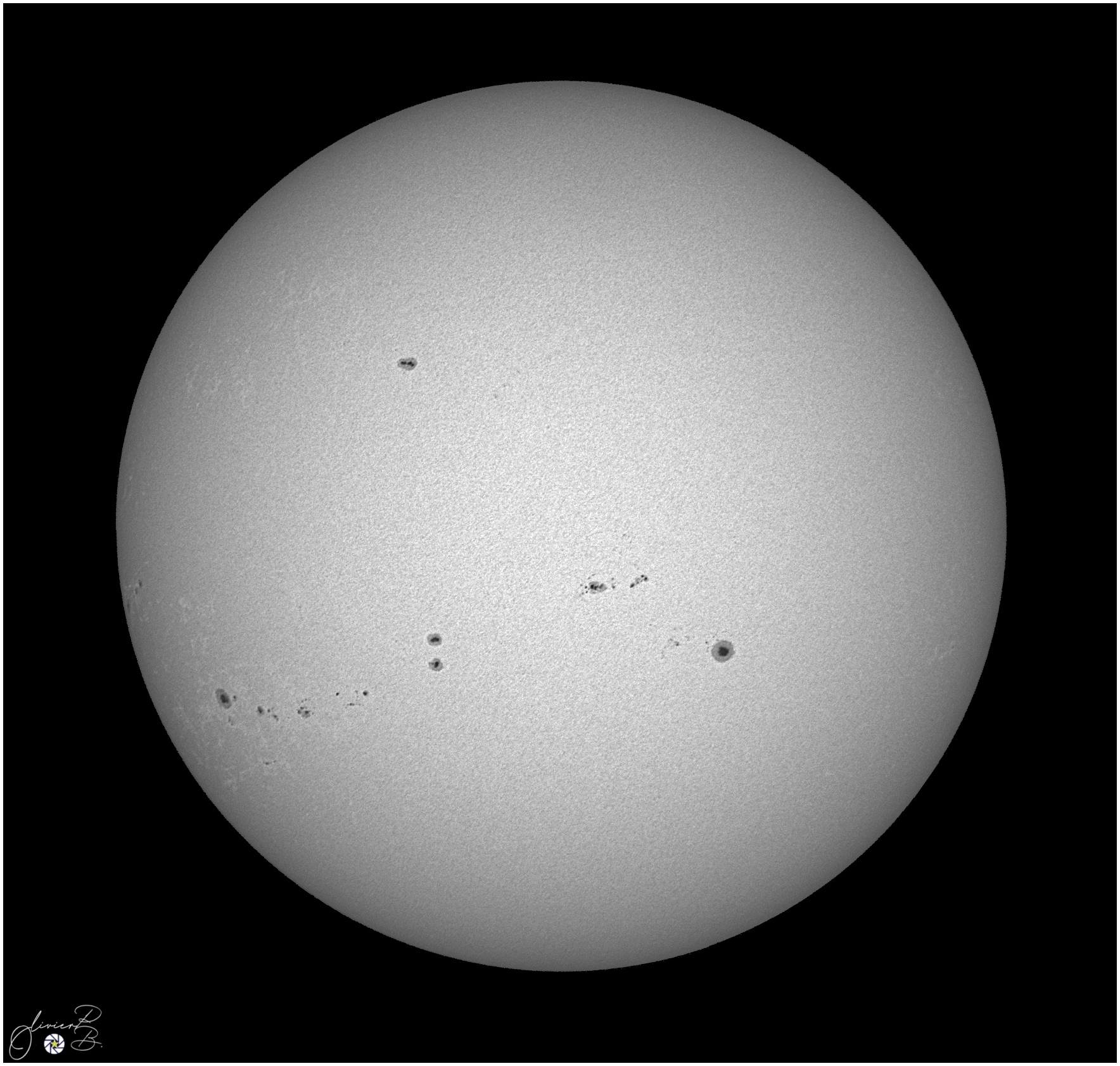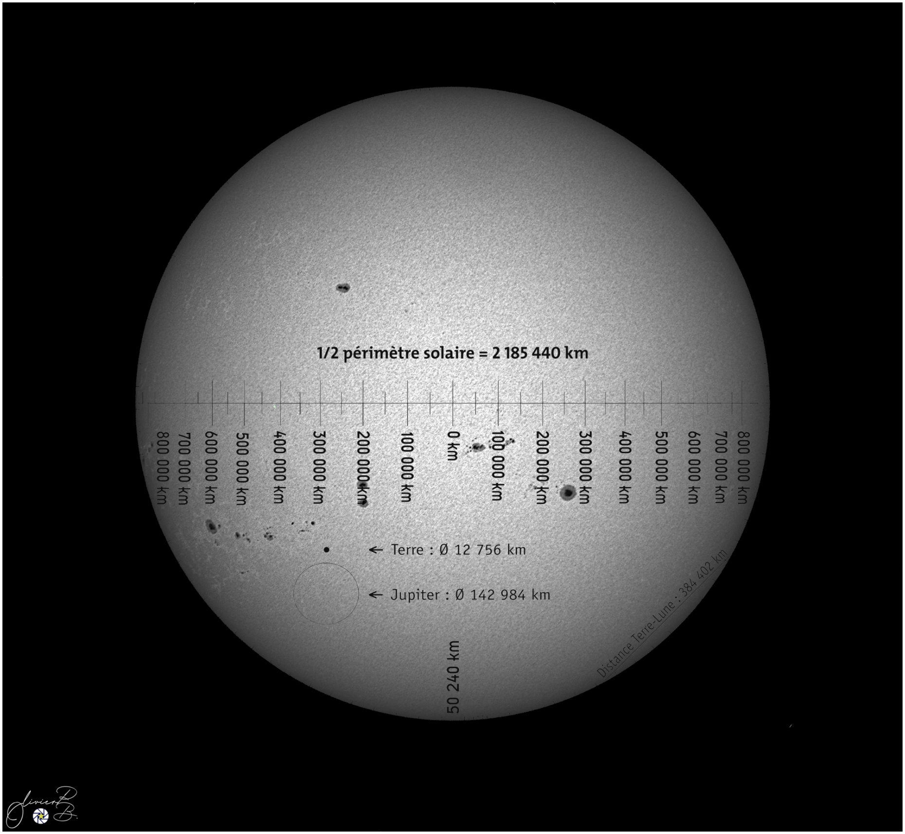 Le Soleil le 27 juin 2024 en lumière blanche , de nombreuses taches visibles à voir l'image avec la règle pour apprécier la taille de notre étoile et de la Terre....